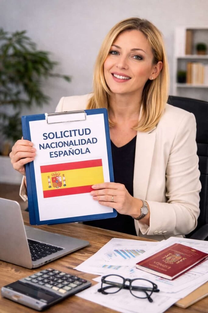 Reservar consulta legalImagen ALT sugerida: mujer inmigrante sonriente sosteniendo expediente de solicitud de nacionalidad española